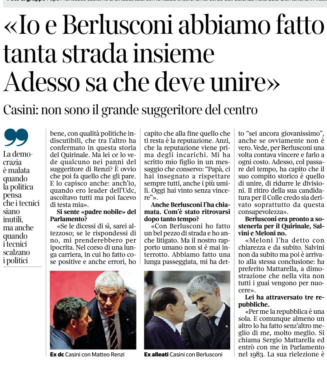 «Altolà. Ma lei ha presente Renzi? È un leader a cui voglio bene, con qualità politiche indiscutibili, che tra l’altro ha confermato in questa storia del Quirinale. Ma lei ce lo vede qualcuno nei panni del suggeritore di Renzi? È ovvio che poi fa quello che gli pare. E lo capisco anche: anch’io, quando ero leader dell’Udc, ascoltavo tutti ma poi facevo di testa mia».