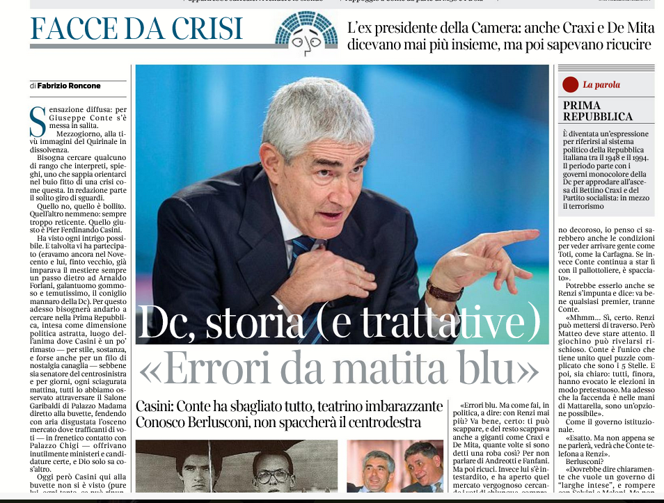 Ha visto ogni intrigo possibile. E talvolta vi ha partecipato (eravamo ancora nel Novecento e lui, finto vecchio, già imparava il mestiere sempre un passo dietro ad Arnaldo Forlani, galantuomo gommoso e temutissimo, il coniglio mannaro della Dc). Per questo adesso bisognerà andarlo a cercare nella Prima Repubblica, intesa come dimensione politica astratta, luogo dell’anima dove Casini è un po’ rimasto — per stile, sostanza, e forse anche per un filo di nostalgia canaglia — sebbene sia senatore del centrosinistra e per giorni, ogni sciagurata mattina, tutti lo abbiamo osservato attraversare il Salone Garibaldi di Palazzo Madama diretto alla buvette, fendendo con aria disgustata l’osceno mercato dove trafficanti di voti — in frenetico contatto con Palazzo Chigi — offrivano inutilmente ministeri e candidature certe, e Dio solo sa cos’altro.