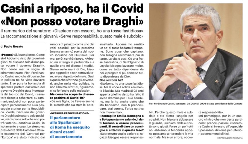 Casini: «Ho il Covid, non posso votare Draghi»