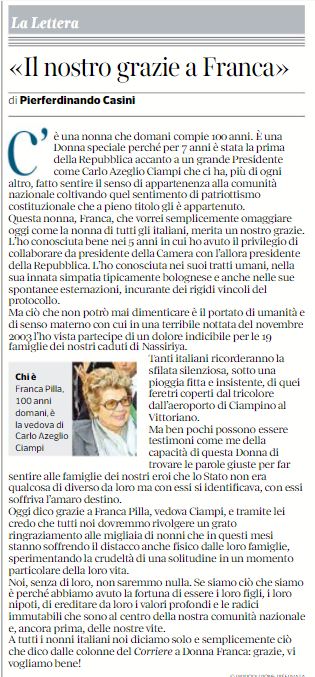 Oggi dico grazie a Franca Pilla, vedova Ciampi, e tramite lei credo che tutti noi dovremmo rivolgere un grato ringraziamento alle migliaia di nonni che in questi mesi stanno soffrendo il distacco anche fisico dalle loro famiglie, sperimentando la crudeltà di una solitudine in un momento particolare della loro vita.