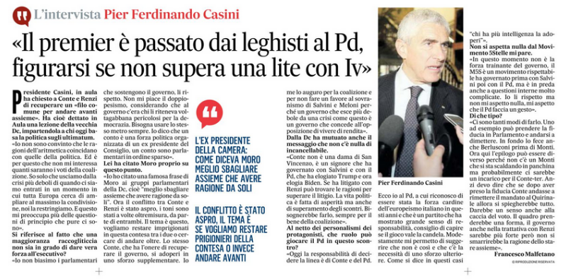 Presidente Casini, in aula ha chiesto a Conte e Renzi di recuperare un «filo comune per andare avanti assieme». Ha cioè dettato in Aula una lezione della vecchia Dc, impartendola a chi oggi basa la politica sugli ultimatum.