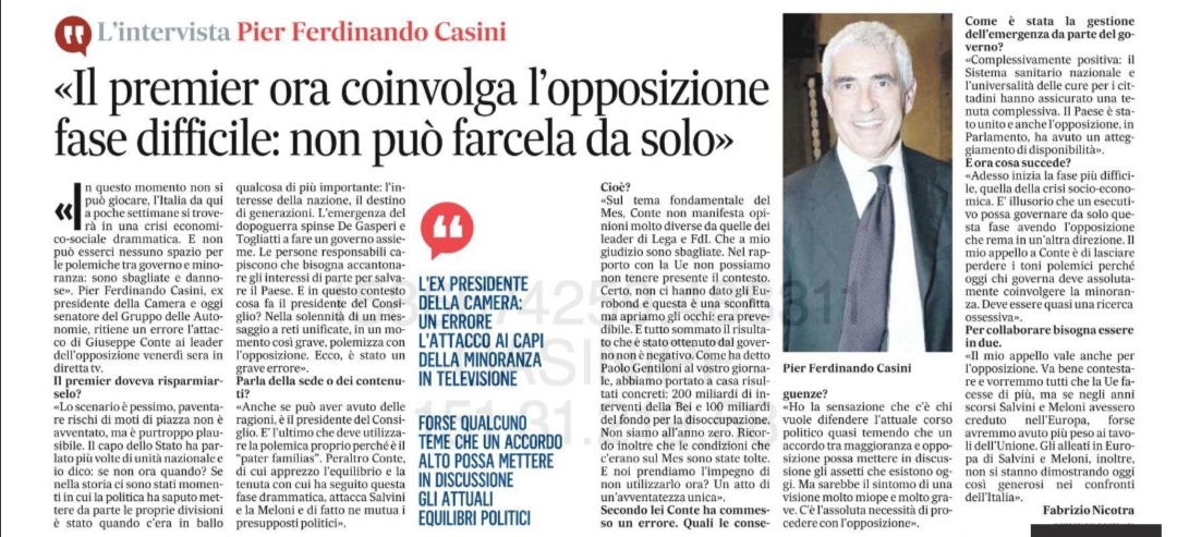 «Adesso inizia la fase più difficile, quella della crisi socio-economica. E’ illusorio che un esecutivo possa governare da solo questa fase avendo l’opposizione che rema in un’altra direzione. Il mio appello a Conte è di lasciare perdere i toni polemici perché oggi chi governa deve assolutamente coinvolgere la minoranza. Deve essere quasi una ricerca ossessiva».