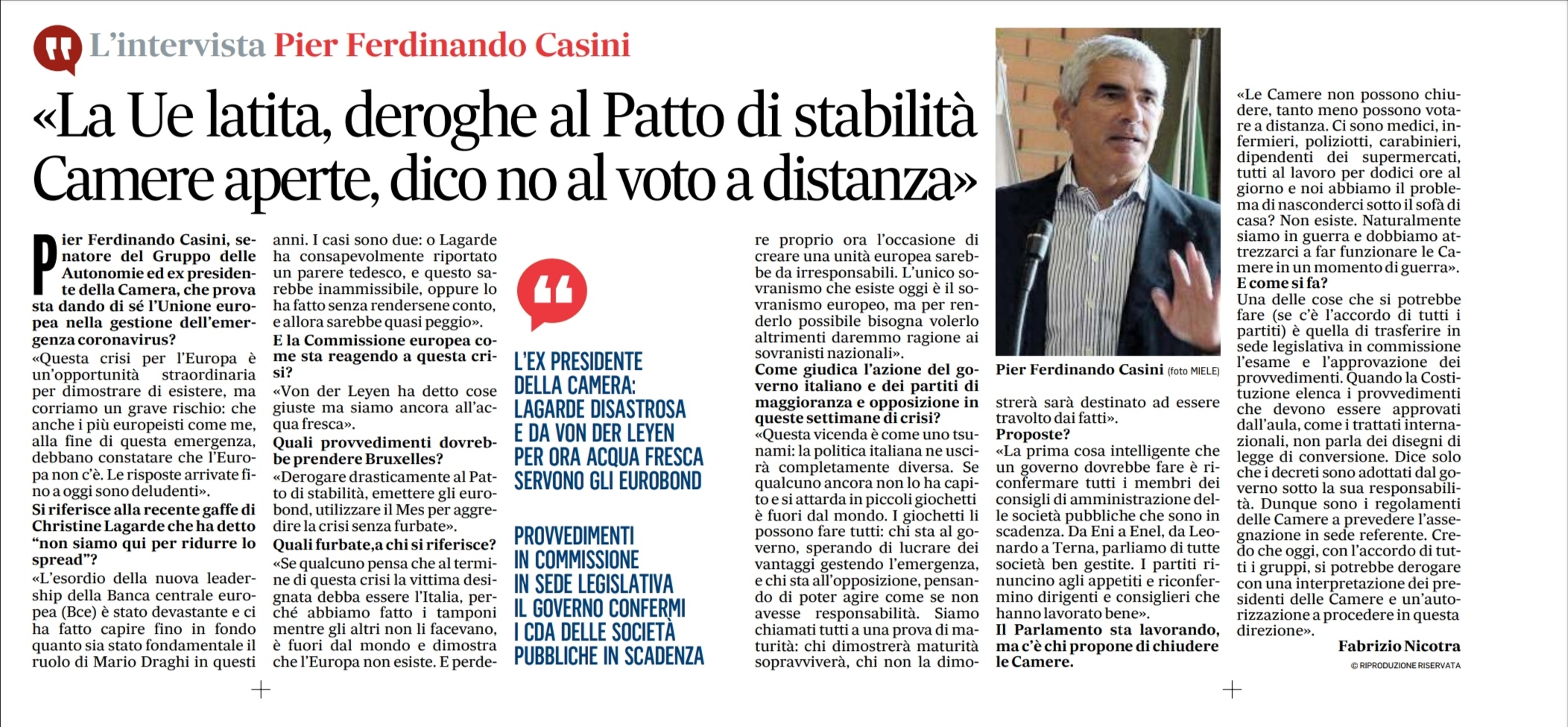«Questa crisi per l’Europa è un’opportunità straordinaria per dimostrare di esistere, ma corriamo un grave rischio: che anche i più europeisti come me, alla fine di questa emergenza, debbano constatare che l’Europa non c’è. Le risposte arrivate fino a oggi sono deludenti».